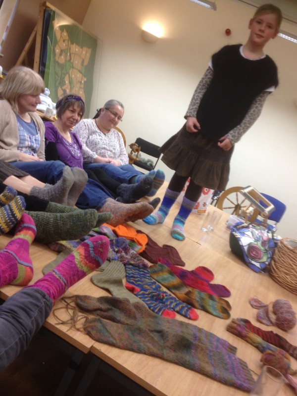 Woolly Socks Day – There was a heavy footfall of hand spun and hand knitted and hand dyed, spun and knitted socks on Saturday’s woolly sock day. My star pupil Mary modelled a lovely pair of socks knitted by Julie – she looked so good in them that Julie gave them to her. What a lucky girl!