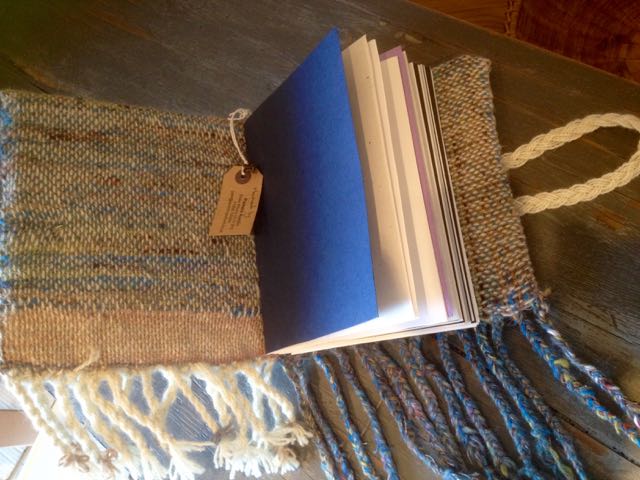 Double weave book took just two days to complete – including the weaving. It is woven on a Knitters Loom with 2nd heddle on 7.5 reeds. Half the warp and all of the weft is in my yarn in spun on a drop spindle on the river Nene last year – see Water Yarn blog June 2014. The other half warp is Leicester long wool. The book will be used to record my work from now on and I hope it will inspire my pupils to do the same. I have been spinning for 30 years – started in September 1985 – and apart from the items I have not given away I have no record of my work. The warp was 10 inches wide(1″ for shrinkage) and the first 9″ double weave joined on the left hand side, the next 9″ section was woven as separate layers; the first folded section forms the outer cover front and back, and the two separate layers form the inside front and inside back cover. The cover is made of cardboard covered with  needle punch felt for padding and extra strength along the binding which was scored to make a neat edge at the fold. The warp ends of each section are twisted together at the bottom of the book cover – it wouldn’t work on the top as the ends dangled over the pages and would have made reading impossible – were I ever get anything written that is! The outside edges are simply stitched together.